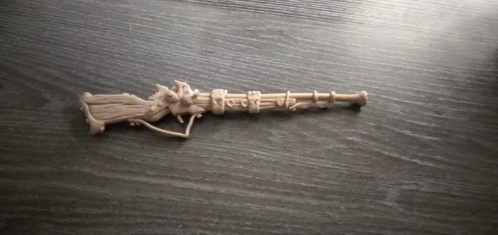 Отдельно делаются аксессуары для фигурки. Желательно сперва делать их, а потом переходить к кистям лапок, дабы можно было еще мягкие пальчики подогнать под предмет, перед тем как запекать их. В нашем случае это варп мушкет.
