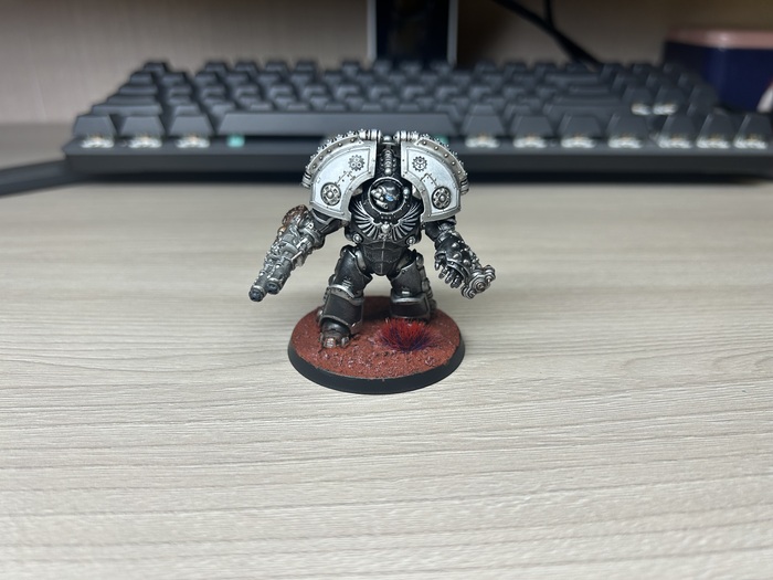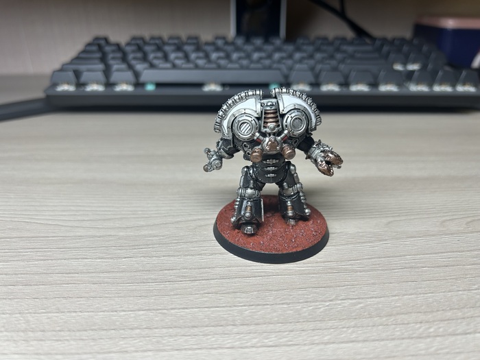 Похвастаюсь немного варбоссом из игры Space Marine, которого красил себе почти год назад. Сделал его более сочным, нежели в игре, там он совсем блёклый и невзрачный. Забацал его для конкурса в достаточно сжатые сроки, так что немного считерил и НММ делал процентов на 60 драйбрашем и проливками. Оказалось неплохим способом накидать базу для такого потертого и ржавого металла, только в конце докидывал самых ярких бликов и царапок.