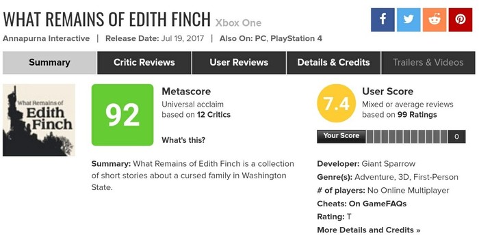Творение Giant Sparrow непростительно короткая игра. 2, максимум 3 часа уйдёт на её прохождение. Но уму непостижимо, как разработчики вложили в эти считанные часы с десяток совершенно различных историй, каждая из которых в полной мере раскрыта и не оставляет после себя чувства недосказанности. Эта трагичная история семьи Финч вызывает такую бурю эмоций, что не сможет дать та или иная игра с куда большим количеством экранного времени. За эти 2-3 часа игра поднимает сложные вопросы о жизни, наших стремлениях, ошибках, побеге от реальности. И о неминуемости смерти, которая порой настолько глупа, что в пору верить в сказки.