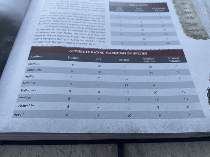 Что такое тиры и для его они нужны, какие виды существ игроки могу использовать для создания своих персонажей. Какие архетипы есть в игре и что с ними можно сделать. Какие фракции есть в игре и каким образом игроки их выбирают или получают к ним доступ. Какими характеристиками оперирует система, какие максимы допустимы и какими навыками и талантами можно владеть. Сколько нужно опыта чтобы взять следующий шаг в характеристике или навыке и так далее. Как и в Фентезийной вахе - игрокам предлагаются 10 вопросов для придания особенностей и шероховатостей своим персонажам. Далее идут боевые и социальные черты, которые указываются на листе персонажа. А завершает всё - кастомные возможности по созданию своего героя, если система архетипов вам не мила.