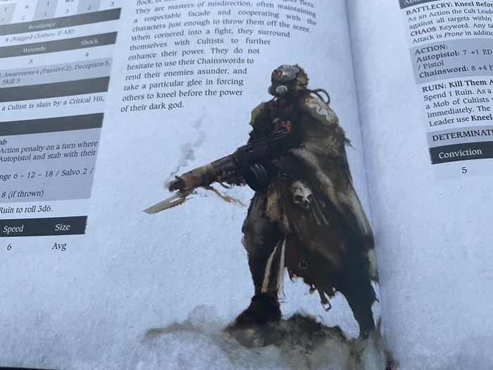 Изначально игра разработана компанией Ulisses North America (или Ulisses Spiele, которые из Германии, но это всё не точно), и должна была стать заменой Dark Heresy. Которая получила в нашей стране достаточно широкую популярность (конечно не такую широкую как D&D) и обрела свой, весьма культовый статус благодаря высокой смертности персонажей и дьяволом в деталях. И в отличие от Ереси, новая ролёвка игро-механически, должна была основываться на дайс пуллах вместо броска одного/двух кубиков, возможно, чтобы больше походить на оригинальный настольный Вархаммер; а нарративно - быть более универсальной, и разрешать игрокам использовать другие расы и сценарии игры, вообще никак не касающиеся Империума. Хотяяяя… здесь надо сделать оговорку и сказать, что Империум всё равно занимает центральное место в Основной Книге Правил. Однако, это никак не умаляет возможность играть за банду орков и бессмысленно всех стукать на предмет самой ходовой и ликвидной валюты зеленокожих. Но даже если мы берем только Империум в качестве играбельной стороны то - возможность примерить на себя роль техножреца, вольного торговца или космического десантника (возможно пресного и унылого, а может быть еретичного и сострадающего) сразу из коробки, довольно круто. Это открывает весьма большие перспективы, и если вы хорошо знаете определённые аспекты вселенной, то скорее всего без проблем сможете наполнить мир бесчисленным количеством крутых моментов. Однако, есть и обратная сторона - если эта вселенная вам не особо знакома, то в Книге Правил вы не обнаружите сверх-детальных описаний, как это было в Тёмной Ереси. Скажем так - полотно здесь заполнено достаточно широкими взмахами кисти в нарративном плане, что немного расстраивает (корник скорее посвящён самим правилам). Но книга всего 382 страницы, поэтому часть грехов может быть списана на дополнения, которые тоже присутствуют.