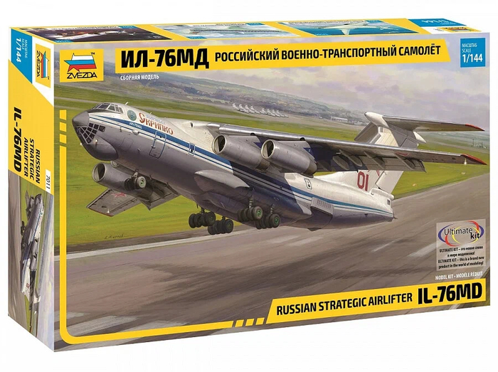 Сборная модель - Военно-транспортный самолёт Ил-76МД. Набор деталей из пластмассы для сборки одной модели самолета. Ил-76 – основной военно-транспортный самолёт СССР и России, совершив первый полёт в 1971 году, он и в настоящее время не теряет своей актуальности и постоянно модернизируется. На нём было установлено более 20 мировых рекордов по грузоподъёмности и скорости. Ил-76 так же является основным самолётом Воздушно-десантных войск и способен десантировать всю номенклатуру техники ВДВ и более 100 бойцов-десантников. Системы РЭБ, установленные на борту, едва ли уступают таковым на современных истребителях. В мире мало техники настолько узнаваемой и настолько удачной, это самолёт-универсал, самолёт-трудяга, самолёт-легенда. Модель собирается при помощи специального клея, выпускаемого предприятием «Звезда». Клей и краски продаются отдельно от набора. Ссылка на набор